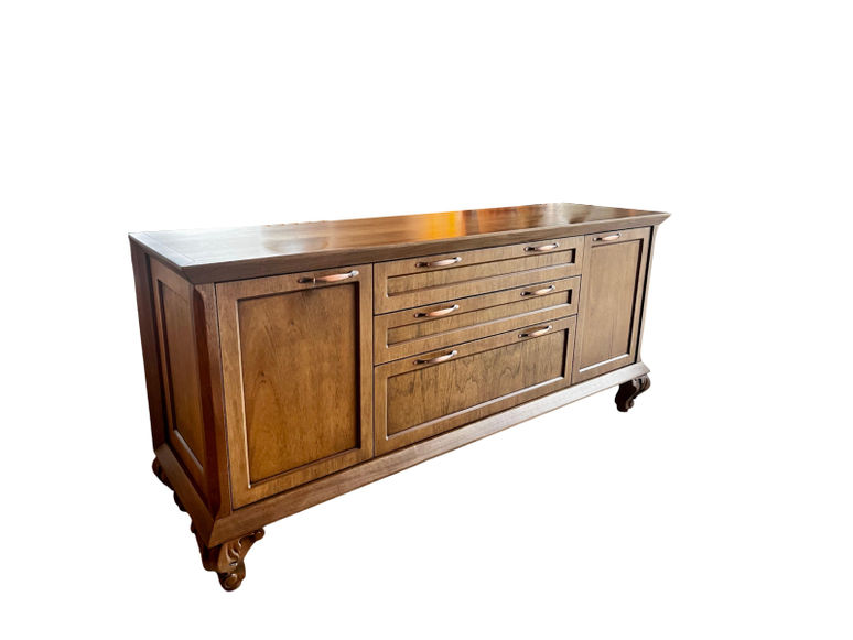 O Balcão Luiz XVI combina a elegância clássica com a funcionalidade moderna, sendo uma peça versátil para diversos ambientes. Produzido em madeira maciça de alta qualidade, possui acabamento natural que evidencia os veios e a beleza da madeira. O design apresenta linhas retas com molduras discretas, complementadas por puxadores metálicos sofisticados. A estrutura conta com duas portas laterais e quatro gavetas centrais de diferentes tamanhos, proporcionando amplo espaço para organização. Seus pés levemente curvados no estilo Luiz XVI adicionam um toque de requinte e atemporalidade.