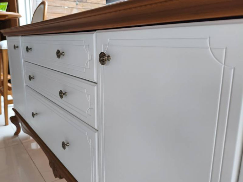 O Balcão Luiz XV é a união perfeita entre o charme clássico e a praticidade do dia a dia. Com estrutura em madeira maciça e acabamento bicolor, combina tampo e base em tom amadeirado natural com portas e gavetas em branco laqueado. Seu design é marcado por linhas elegantes e pés curvados no estilo Luiz XV, que trazem sofisticação e leveza à peça. Possui duas portas laterais e três gavetas centrais espaçosas, ideais para armazenar utensílios, louças ou objetos decorativos, tornando-o funcional e versátil para diversos ambientes.