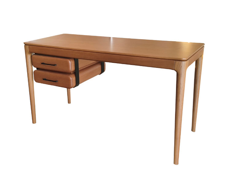 Os pés alongados e levemente afilados conferem leveza ao móvel, enquanto as gavetas compactas e discretas, posicionadas lateralmente, oferecem o espaço necessário para guardar objetos de uso diário, mantendo a organização do ambiente.