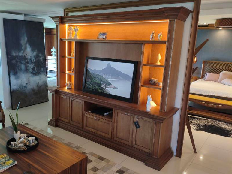 Este home para TV é a união perfeita entre imponência e sofisticação clássica. Com design robusto e acabamento em madeira nobre, ele transmite elegância atemporal ao ambiente. Sua estrutura conta com nichos laterais e prateleiras superiores, ideais para decoração e objetos pessoais, além de amplo espaço central para acomodar a televisão. Na parte inferior, portas e gavetas bem distribuídas oferecem excelente capacidade de armazenamento, mantendo a organização do espaço. Os detalhes em molduras trabalhadas reforçam o estilo clássico e refinado, transformando sua sala em um ambiente acolhedor e sofisticado.