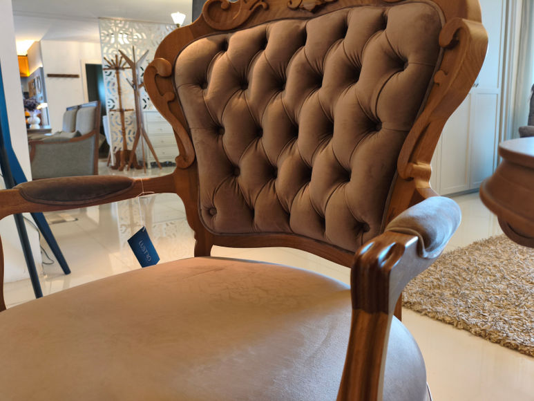 Poltrona clássica com design sofisticado, ideal para quem aprecia peças atemporais. Sua estrutura em madeira maciça apresenta entalhes detalhados e acabamento natural que realça o trabalho artesanal. O encosto capitonê, combinado ao estofamento em tecido aveludado, oferece conforto e um toque luxuoso, enquanto as curvas suaves dos braços e dos pés remetem ao estilo provençal. Perfeita para salas de estar, halls ou ambientes de leitura, esta poltrona agrega charme, elegância e um ar refinado à decoração.